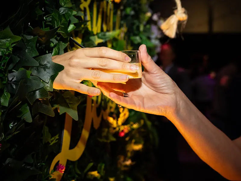 De gasten werden ontvangen met een bubbel in een sfeervol aangeklede zaal vol bloemen. Samen met Hands on Board zorgden we voor de complete setting, met in het midden de eyecatcher van een grote bar.